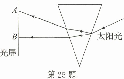 25. 八(1)班的同学们在探究光的色散现象时,让一束太阳光通过三棱镜,同学们在白色光屏上可以看到多种色光,如图所示最上面的色光是