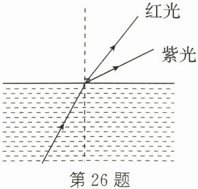 26. 小明通过实验研究光从水射入空气中的现象,如图所示是他根据实验现象画的光路图:图中入射光是红光和紫光混合在一起的光,当射到空气中时,两束光线分开,这种折射现象叫作光的