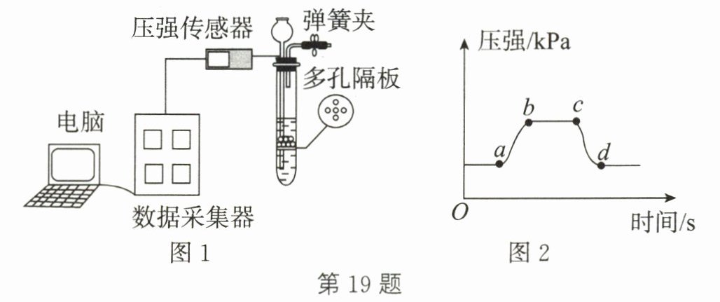 19. 兴趣小组在实验室制取$CO_2$的发生装置中连接上压强传感器,如图1所示。测得实验过程中试管内气体压强的变化情况如图2所示。下列说法错误的是(