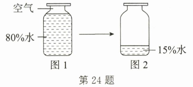24. (8分)探究铁丝在氧气中燃烧的实验时,小明进行了如下实验:集气瓶中装有80%的水(图1),用排水法收集氧气后,集气瓶中仍留有15%的水(图2)。