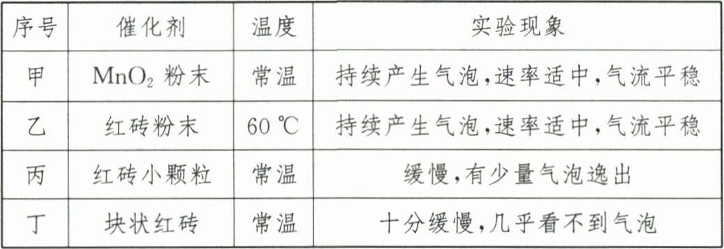 ④ 在一定温度下,另取2 g红砖小颗粒,向其中加入8%的过氧化氢溶液20 mL,继续实验,发现产生气泡的速率明显比实验丙快。请分析可能的原因: