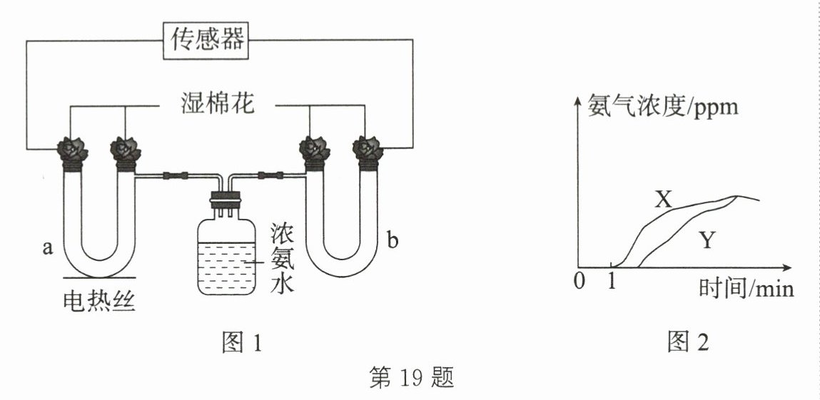 19. 某同学为了探究微粒性质,按图1进行实验,并借助传感设备测得U形管a、b中氨气浓度随时间变化的曲线如图2所示。下列说法正确的是(