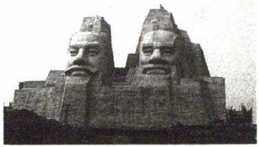 材料二:在河南郑州黄河岸边的炎黄广场,有宏伟的炎帝和黄帝巨型塑像(见右图)。塑像高106米、眼长3米、鼻长8米。塑像以山为体,山人合一,浑然天成。塑像中高者为炎帝,广额纯朴,智慧慈爱;矮者为黄帝,威武刚强,气宇轩昂。炎帝和黄帝塑像体现了不屈不挠、勤劳勇敢和开拓前进的宏伟气概。它的建成,大大增强了全球华人的民族自豪感和凝聚力。