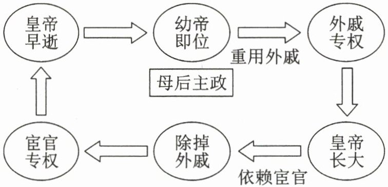 D选项:图片清晰地展示了皇帝早逝、幼帝即位后,母后主政,重用外戚导致外戚专权;皇帝长大后,依赖宦官除掉外戚,又造成宦官专权,之后皇帝早逝等情况循环出现,体现了外戚宦官交替专权这一历史现象,所以D选项正确。
