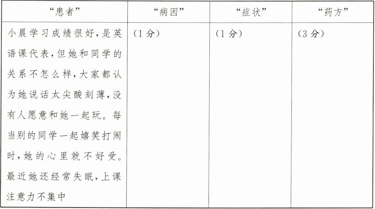 | 小晨学习成绩很好,是英语课代表,但她和同学的关系不怎么样,大家都认为她说话太尖酸刻薄,没有人愿意和她一起玩。每当别的同学一起嬉笑打闹时,她的心里就不好受。最近她还经常失眠,上课注意力不集中 | (1分)______ | (1分)______ | (3分)______ |