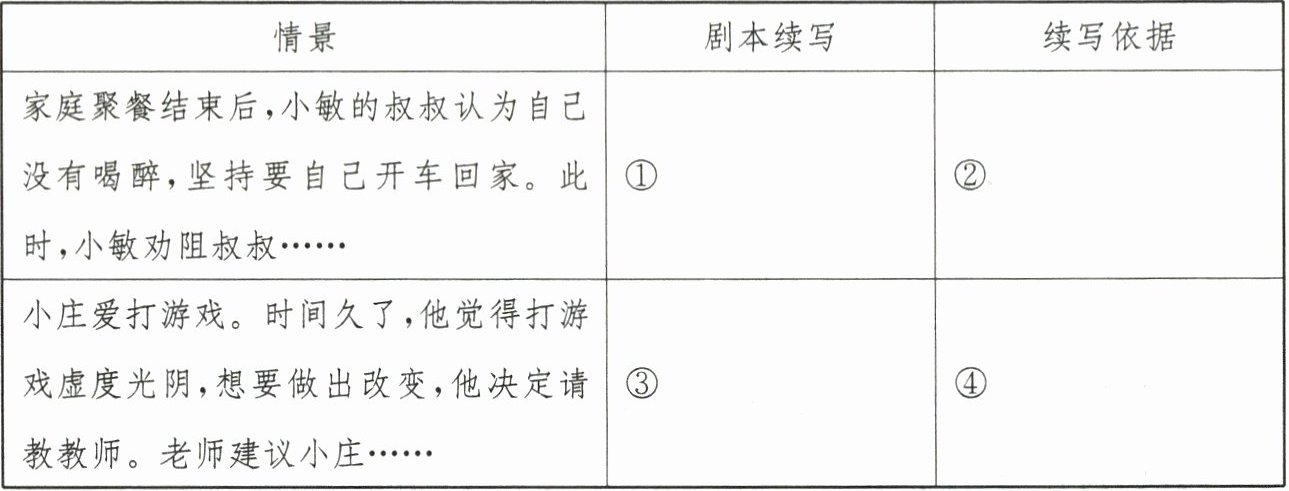 (3)结合所学知识,将上述表格补充完整。要求:① 剧本续写内容要积极、向上,符合正确价值观;② 续写依据可从增强安全意识、滋养心灵等角度加以说明。(4分)