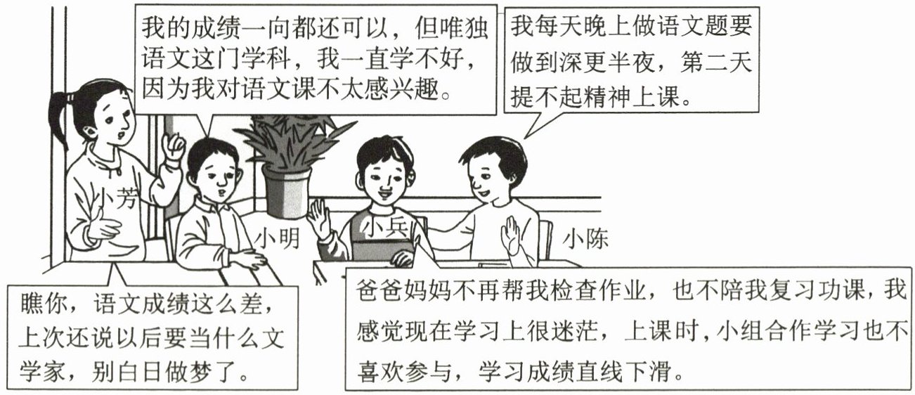 (1)①小明:“因为我对语文课不太感兴趣”,说明学会学习需要发现并保持对学习的兴趣。②小陈:“我每天晚上做语文题要做到深更半夜,第二天提不起精神上课”,说明学会学习需要掌握科学的学习方法。③小兵:“上课时,小组合作学习也不喜欢参与”,说明学会学习要善于运用不同的学习方式。(每点1分,共3分)