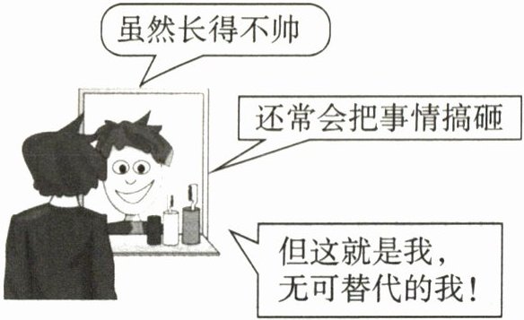 选项C:待人宽容友善主要针对的是与他人相处时的态度,漫画主要围绕对自己的认识和接纳,并非与他人相处,该选项不符合漫画主旨。