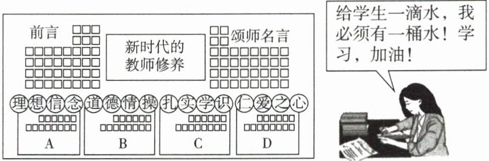 【解析】:本题主要考查对教师工作理念和工作方式变化以及新时代教师修养相关内容的理解。题目中给出了一张包含“给学生一滴水,我必须有一桶水!学习,加油!”话语的图片素材,这句话强调了教师自身要有丰富的知识储备,才能更好地教导学生,这体现的是教师扎实的学识。然后看电子板报的各个板块,A板块是理想信念,B板块是道德情操,C板块是扎实学识,D板块是仁爱之心,所以该素材应放置在体现扎实学识的C板块。