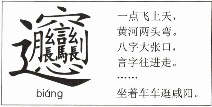 biáng 一点飞上天,黄河两头弯。八字大张口,言字往进走。……坐着车车逛咸阳。