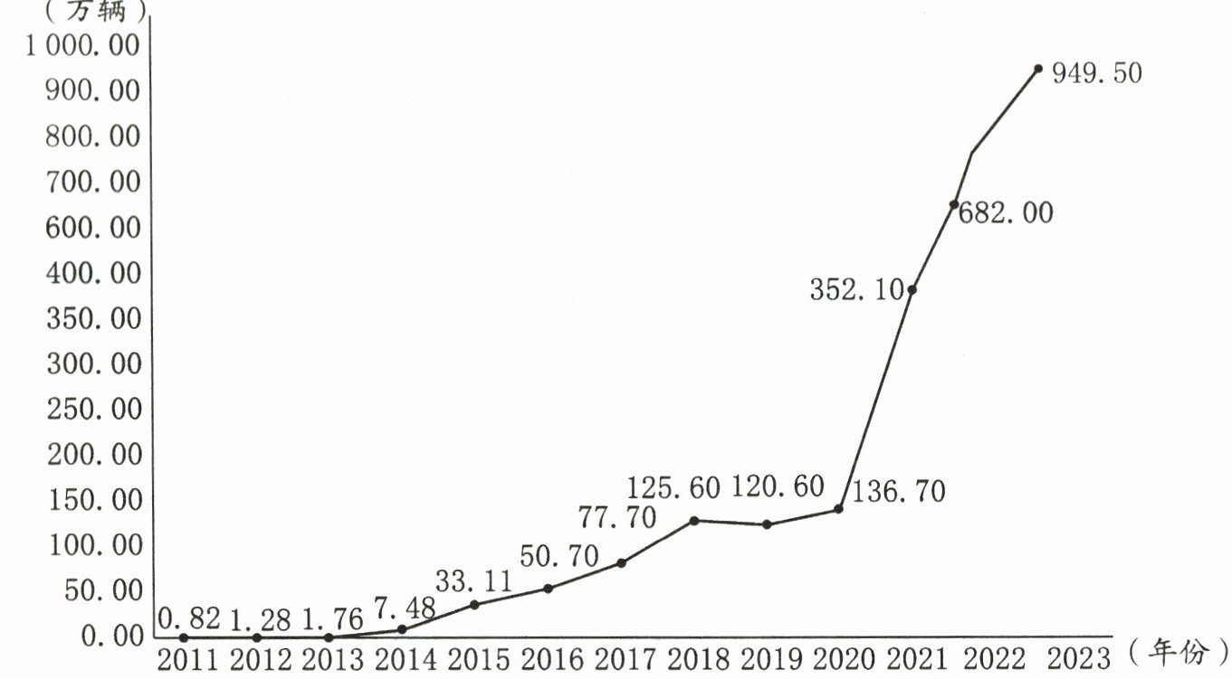 )(年份:2011-2023,销量(万辆):2011年0.82,2012年1.28,2013年1.76,2014年7.48,2015年33.11,2016年50.70,2017年77.70,2018年125.60,2019年120.60,2020年136.70,2021年352.10,2022年682.00,2023年949.50)