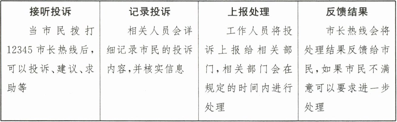 | 当市民拨打12345市长热线后,可以投诉、建议、求助等 | 相关人员会详细记录市民的投诉内容,并核实信息 | 工作人员将投诉上报给相关部门,相关部门会在规定的时间内进行处理 | 市长热线会将处理结果反馈给市民,如果市民不满意可以要求进一步处理 |