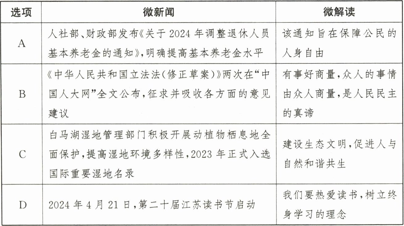 8. 新闻解读是学习道德与法治课的常用形式。下列表格中的“微新闻”与“微解读”不匹配的是(