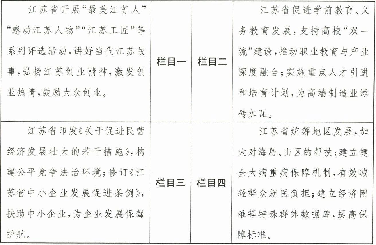 | 江苏省开展“最美江苏人”“感动江苏人物”“江苏工匠”等系列评选活动,讲好当代江苏故事,弘扬江苏创业精神,激发创业热情,鼓励大众创业。 | 江苏省促进学前教育、义务教育发展,支持高校“双一流”建设,推动职业教育与产业深度融合;实施重点人才引进和培育计划,为高端制造业添砖加瓦。 | 江苏省印发《关于促进民营经济发展壮大的若干措施》,构建公平竞争法治环境;修订《江苏省中小企业发展促进条例》,扶助中小企业,为企业发展保驾护航。 | 江苏省统筹地区发展,加大对海岛、山区的帮扶;建立健全大病重病保障机制,有效减轻群众就医负担;建立经济困难等特殊群体数据库,提高保障标准。 |