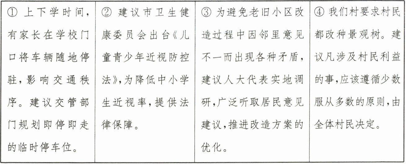 )| ① 上下学时间,有家长在学校门口将车辆随地停放,影响交通秩序。建议交管部门规划即停即走的临时停车位。 | ② 建议市卫生健康委员会出台《儿童青少年近视防控法》,为降低中小学生近视率,提供法律保障。 | ③ 为避免老旧小区改造过程中因邻里意见不一而出现各种矛盾,建议人大代表实地调研,广泛听取居民意见建议,推进改造方案的优化。 | ④ 我们村要求村民都改种景观树。建议凡涉及村民利益的事,应该遵循少数服从多数的原则,由全体村民决定。 |