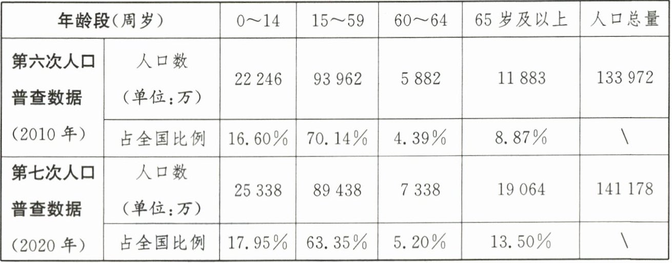 1. 比较阅读是常见的学习方法。分析下表中我国两次人口普查数据,可知(