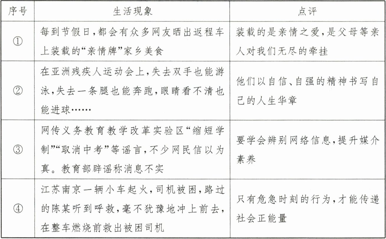 | ③ | 网传义务教育教学改革实验区“缩短学制”“取消中考”等谣言,不少网民信以为真。教育部辟谣称消息不实 | 要学会辨别网络信息,提升媒介素养 |