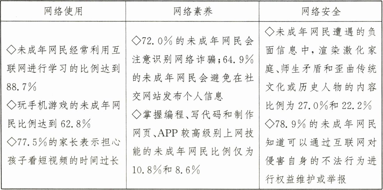 材料二 2023年12月,共青团中央维护青少年权益部联合中国互联网络信息中心发布《第5次全国未成年人互联网使用情况调查报告》。下面是从报告中选取整理的三组数据: