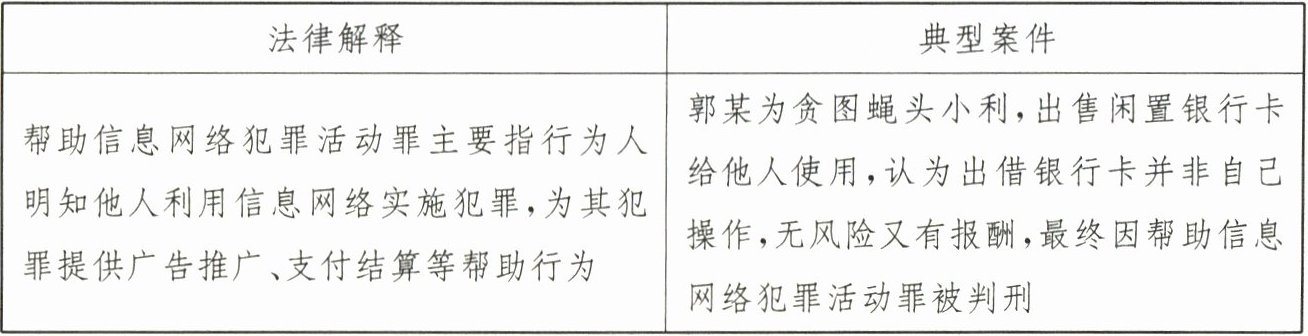 | 帮助信息网络犯罪活动罪主要指行为人明知他人利用信息网络实施犯罪,为其犯罪提供广告推广、支付结算等帮助行为 | 郭某为贪图蝇头小利,出售闲置银行卡给他人使用,认为出借银行卡并非自己操作,无风险又有报酬,最终因帮助信息网络犯罪活动罪被判刑 |