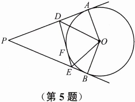 5. 如图,过$\odot O$ 外一点 $P$ 作圆的切线 $PA$,$PB$,$F$ 是劣弧 $AB$ 上任一点,过点 $F$ 作$\odot O$ 的切线,分别交 $PA$,$PB$ 于点 $D$,$E$,已知 $PA = 12\mathrm{cm}$,$\angle P = 44^{\circ}$.
