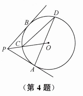 4. 如图,过点$\odot O$ 外一点 $P$ 引$\odot O$ 的两条切线 $PA$,$PB$,切点分别是 $A$,$B$,$OP$ 交$\odot O$ 于点 $C$,$D$ 是优弧$\overset{\frown}{ABC}$ 上不与点 $A$,$C$ 重合的一个动点,连接 $AD$,$CD$. 若$\angle APB = 80^{\circ}$,则$\angle ADC$ 的度数是(