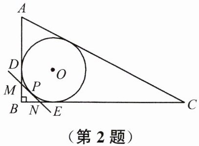 2. 如图,$\mathrm{Rt}\triangle ABC$ 的内切圆$\odot O$ 与两直角边 $AB$,$BC$ 分别相切于点 $D$,$E$,过劣弧$\overset{\frown}{DE}$(不包括端点 $D$,$E$)上任一点 $P$ 作$\odot O$ 的切线 $MN$,与 $AB$,$BC$ 分别交于点 $M$,$N$. 若$\odot O$ 的半径为 $r$,则 $\mathrm{Rt}\triangle MBN$ 的周长为(