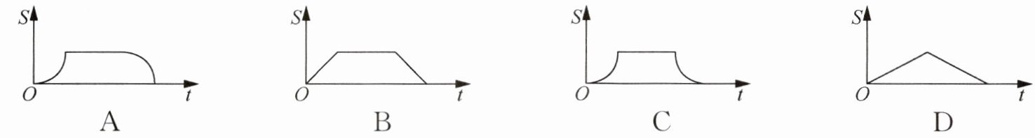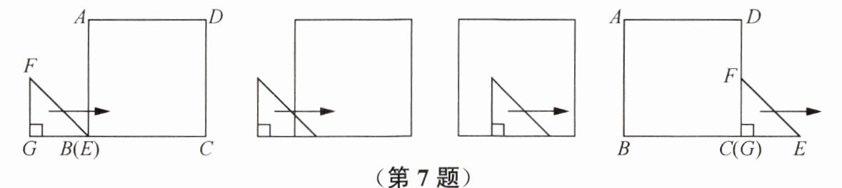 7. 如图,等腰直角三角形$EFG$的直角边$GE$与正方形$ABCD$的边$BC$在同一直线上,且点$E$与点$B$重合,$\triangle EFG$沿$BC$方向匀速运动,当点$G$与点$C$重合时停止. 设运动时间为$t$,运动过程中$\triangle EFG$与正方形$ABCD$的重叠部分面积为$S$,则$S$关于$t$的函数图象大致为(