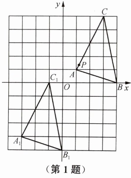1. 如图,将正方形网格放置在平面直角坐标系中,其中每个小正方形的边长均为 $ 1 $,$ \triangle ABC $ 经过平移后得到 $ \triangle A_1B_1C_1 $,若 $ AC $ 上一点 $ P(1.2,1.4) $ 平移后对应点为 $ P_1 $,点 $ P_1 $ 绕原点顺时针旋转 $ 180^{\circ} $,对应点为 $ P_2 $,则点 $ P_2 $ 的坐标为(
