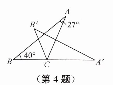 4. 如图,将△ABC绕点C按顺时针旋转至△A'B'C,使点A'落在BC的延长线上. 已知∠A=27°,∠B=40°,则∠ACB'=
