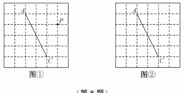 8. 图①、图②是两张形状和大小完全相同的方格纸,方格纸中每个小正方形的边长均为1,线段AC的两个端点均在小正方形的顶点上。