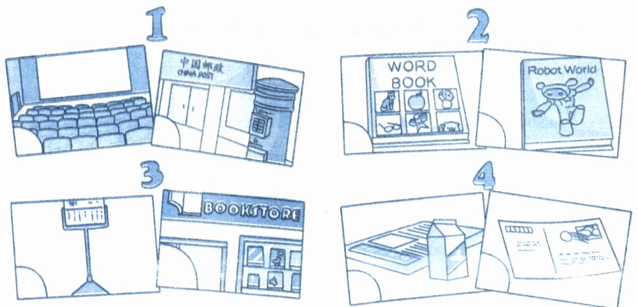 1. see a film 2. read a comic book 3. going to the bookstore 4. buy a postcard