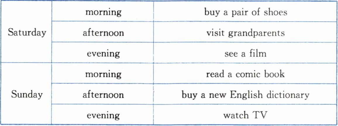 I'm going to have a busy weekend. On Saturday morning, I'm going to buy a pair of shoes with my mother. On Saturday afternoon, I'm going to visit my grandparents. In the evening, I'm going to see a film. On Sunday morning, I'm going to read a comic book. On Sunday afternoon, I'm going to buy a new English dictionary. On Sunday evening, I'm going to watch TV.