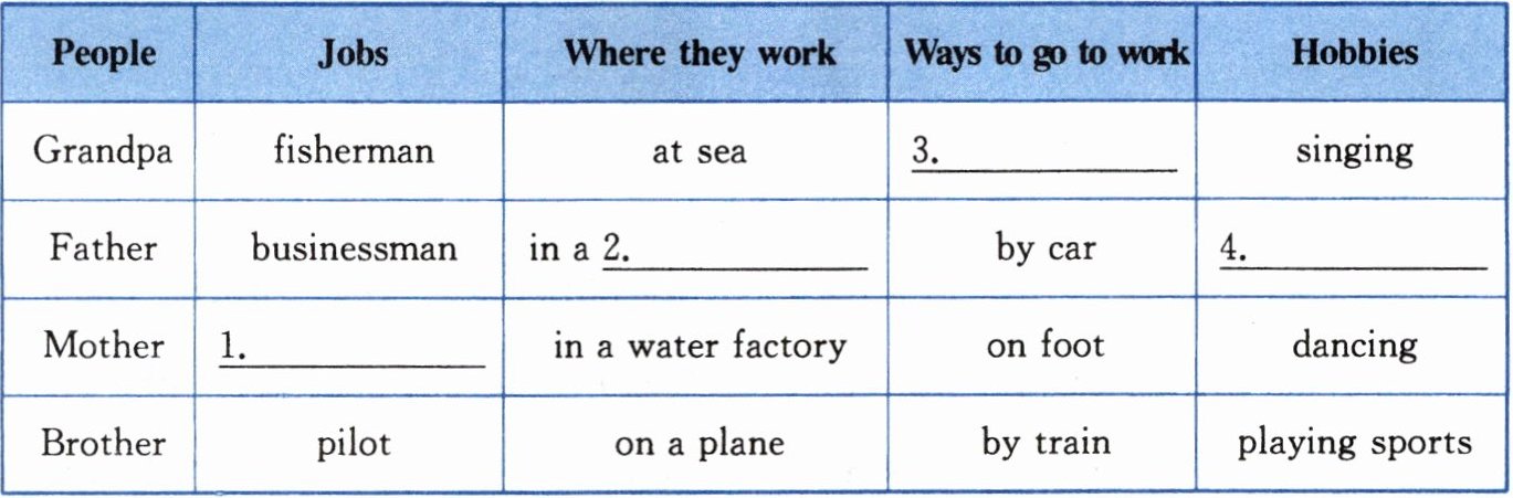 3. by bike 由“My grandpa is a fisherman.”“He goes to work by bike.”可知。