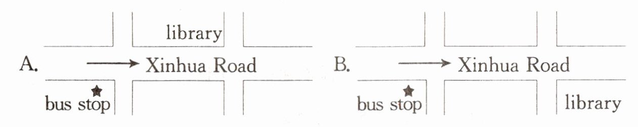 4.B 由"Woman:You can take the No.9 bus, and get off at Xinhua Road. Then go straight, turn right at the second crossing. The library is on your left."可知。