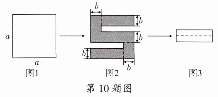 10. 如图1,将一个边长为 $ a $ cm的正方形纸片剪去两个完全相同的小长方形,得到图2,再将剪下的两个小长方形拼成一个新的长方形,如图3所示。