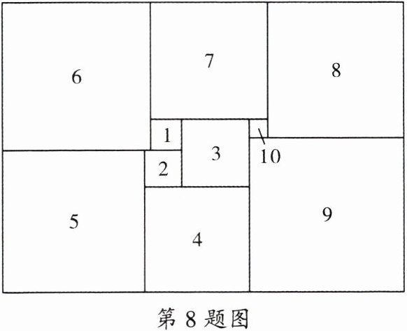 8. 新情境 1925年,数学家莫伦发现了世界上第一个完美长方形,它恰能被分割成10个大小不同的正方形。如图,图中的数字为正方形编号,其中标注1,2的正方形边长分别为 $ x $,$ y $。当 $ y - x = 1 $ 时,第10个正方形的面积是 (