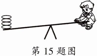 15. 如图,跷跷板的一端放置4个相同质量的沙包,体重为45kg的阿豪坐在另一端压不上来,当他怀抱1个同样质量的沙包时,跷跷板恰好保持平衡。设每个沙包的质量为$x$kg。