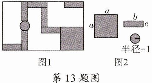 13. 如图1,在一块长方形区域中布置了图中阴影部分所示的展区,其中的展台有三种不同的形状,其规格如图2所示。根据图中信息,用等式表示$a$,$b$,$c$满足的关系为