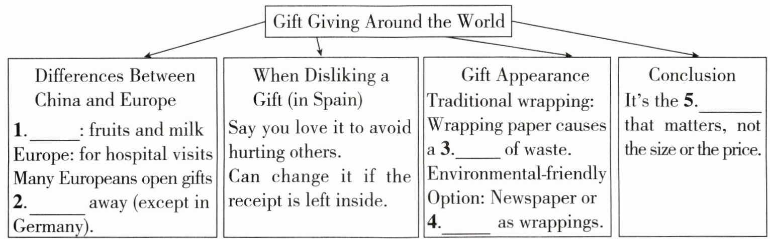 How the gift looks is also important. However, by using wrapping paper( 包装纸) for every gift we buy, we will make a lot of wastes( 垃圾). Now many people are choosing newspaper or maps as wrappings to help protect the environment.