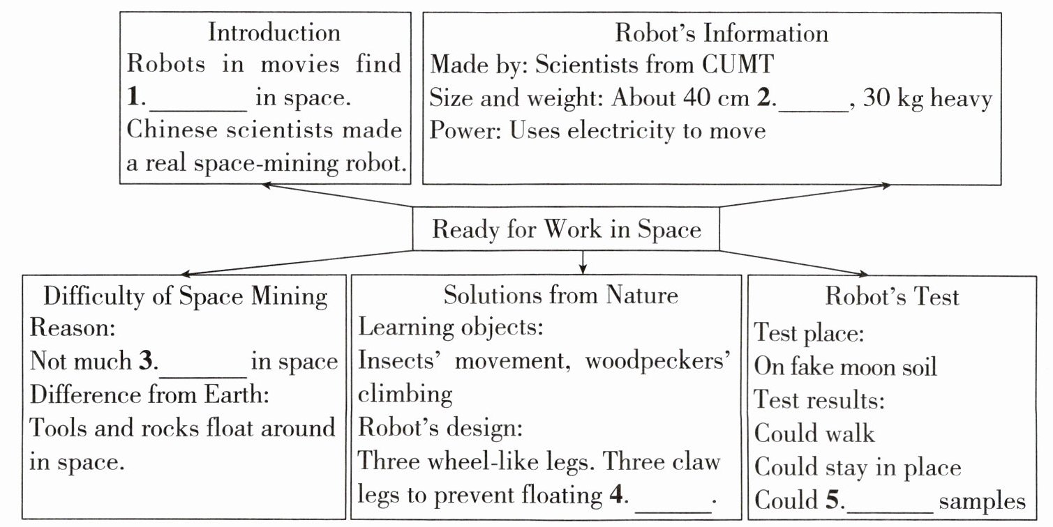 To solve this,the CUMT team learned from nature. They studied how insects move and woodpeckers( 啄木鸟) climb trees. Then they gave the robot three wheel-like legs to move quickly on asteroids( 小行星). It also has three claw( 爪子) legs to hold on tightly,so it won’t float away.