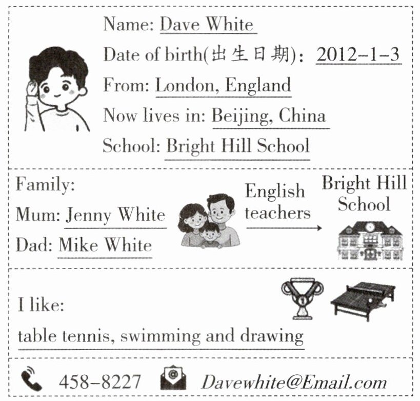 Hello, boys and girls! I'm Dave White. Here is my information card. Do you want to be my friend?