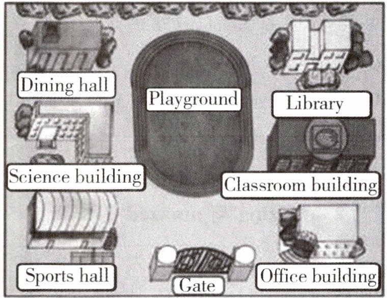 There are six buildings in our school. The playground is in the middle of our school. The sports hall is on the left of the gate. The science building is between the dining hall and the sports hall. The office building is on the right of the gate. The classroom building is between the library and the office building. My school is very big and beautiful.