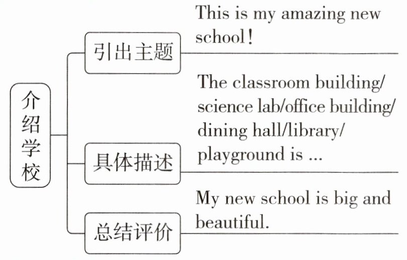This is my amazing new school! My school is not very big but very beautiful. There are five buildings in my school: a classroom building, a science lab, an office building, a dining hall, and a library. The classroom building is in the middle of the school. The science lab is next to the classroom building. The office building is behind the classroom building. The dining hall is on the left of the office building. The library is on the right of the classroom building. There is a big playground in front of the classroom building. There are many trees and flowers around the playground, so the school looks very nice.