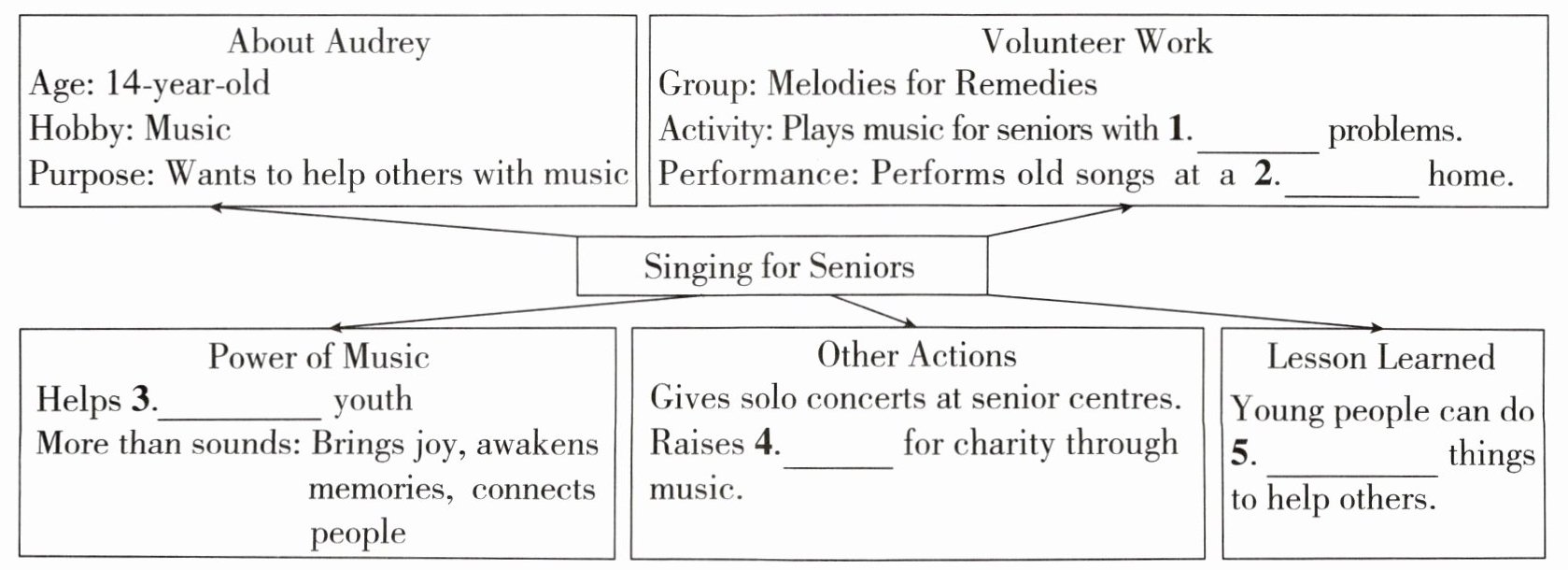)7. What happened when Audrey’s group played old songs at the nursing home?A. The elderly people danced happily.