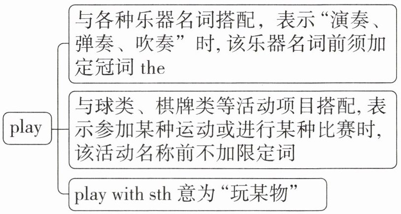 与各种乐器名词搭配,表示“演奏、弹奏、吹奏”时,该乐器名词前须加定冠词 the