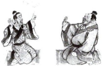 【示例】左边的人物是"杞人",右边的人物是"晓之者"。左边的人左手指天,肢体动作紧张,看上去正"忧天地崩坠,身亡所寄",所以是"杞人";右边的人做出摆手的样子,可见他否认杞人的说法,正在开导他,所以是"晓之者"。