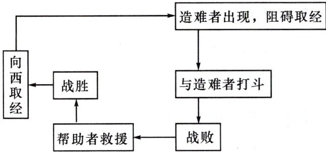 1. 同学将《西游记》八十一难的大多数叙事套路梳理成下图,请你结合书中一个具体情节阐述你对图示的理解。