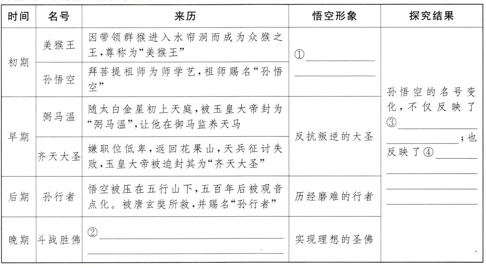 1. 同学们围绕“悟空的名号变化”进行了专题探究。请你阅读下面表格,根据提示,将表格内容填写完整,帮助他们完成探究任务。
