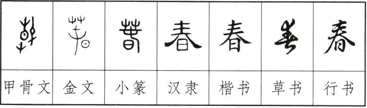 “春”字早期写法一般是由“屮(草)、日、屯”等组构而成,其中“屯”就是一颗正在发芽的种子形象。我们可以猜想古人创造“春”字的想法是: