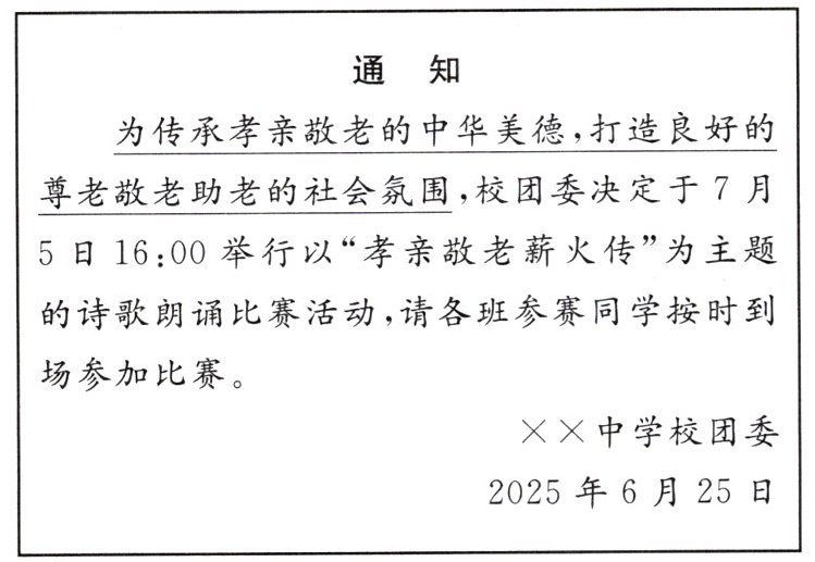 (3)诗歌朗诵小组以校团委的名义拟写了一则通知,请你仔细阅读并完善。(4 分)